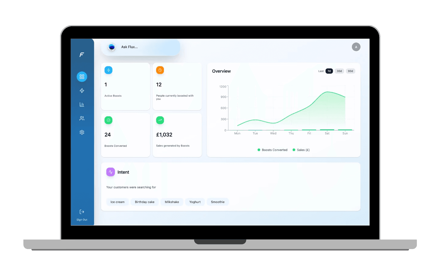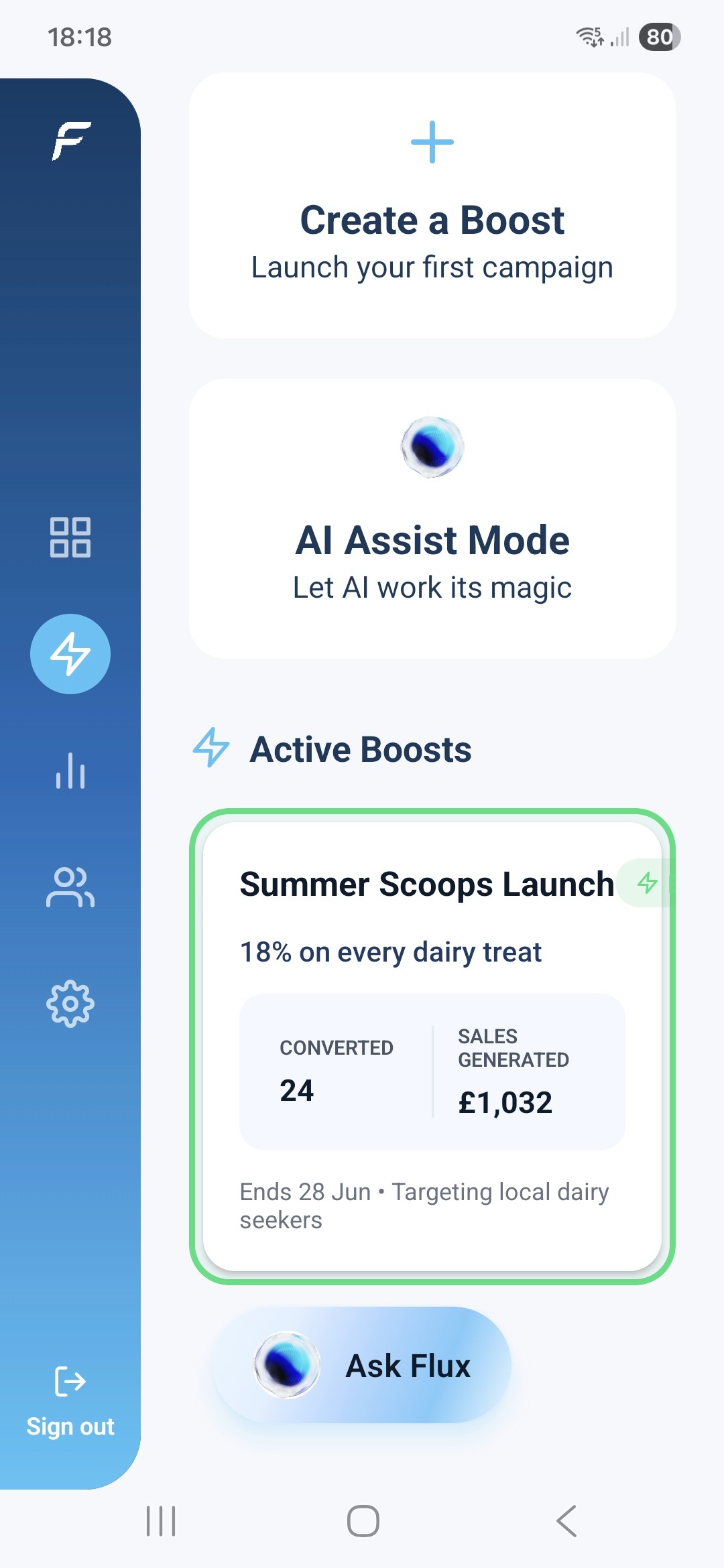 Flux turns your regular discounts into Boosts — smart, AI-powered offers your customers actually understand. Instead of generic promotions, Flux translates your discount into instant spending power your shoppers see before they even step inside. With Boosts, you can showcase your offers in real time, reach customers without needing their personal data, and watch how they react live. Flux’s AI simply helps you look after your customers, win new business, and drive more foot traffic — all automatically.